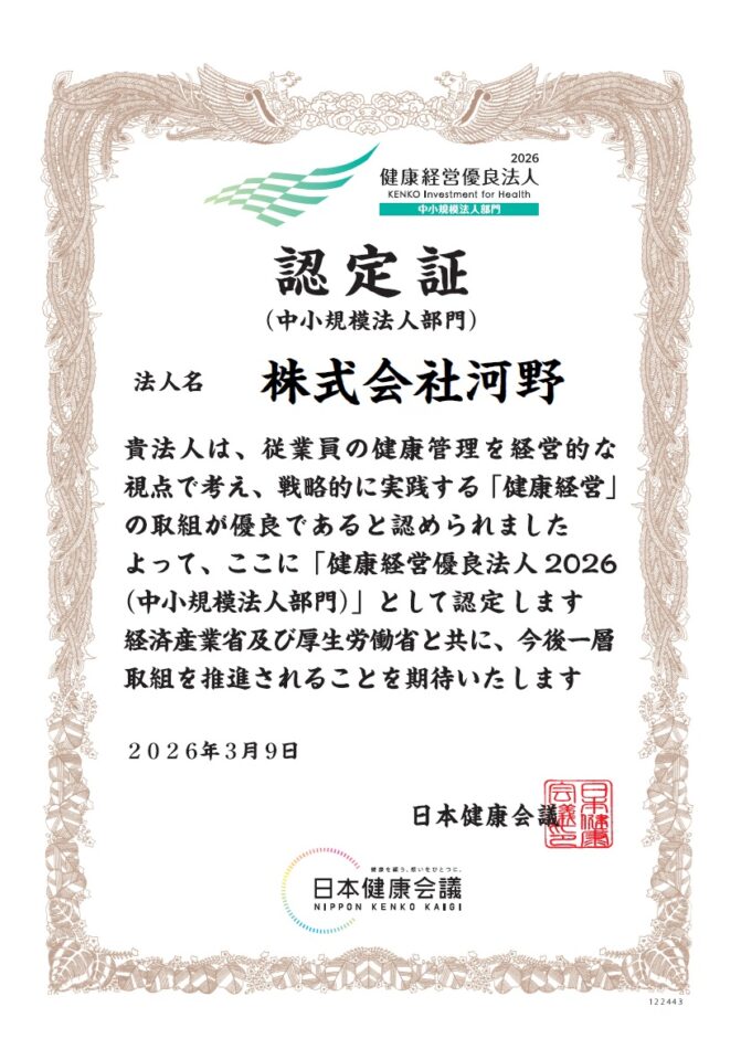 株式会社河野は、経済産業省と日本健康会議が実施する「健康経営優良法人認定制度」において、『健康優良法人2025(中小規模法人部門)』に認定されています。